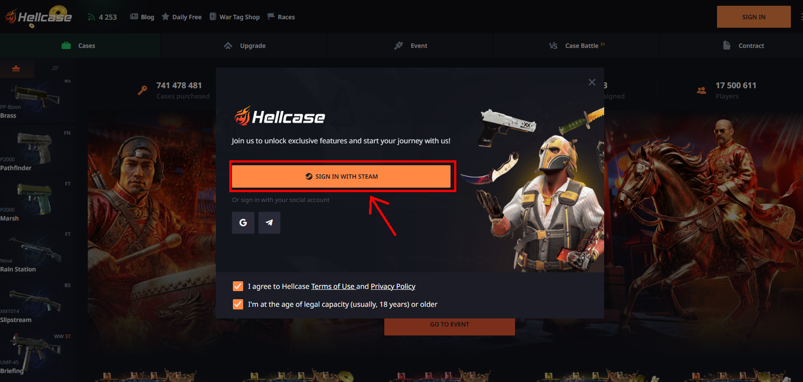 Click on one of the listed Hellcase codes here. A new tab with the official Hellcase website will open.